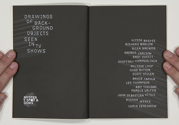 This book is a (pop) cultural mining project. Background objects seen in fictitious places, television show sets, are brought to the forefront and interpreted by 16 artists covering a wide range of TV genres and drawing styles.